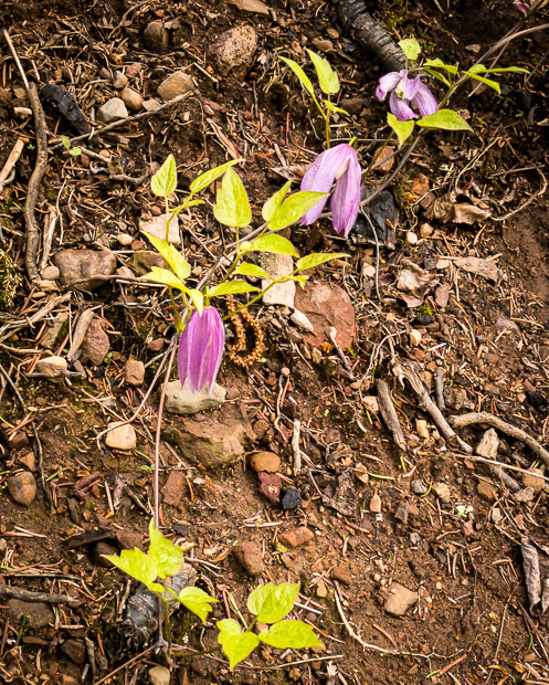 The prize of the trip was a beautiful pink flower next to the bridge. It was not one that I recognized nor could I find it in any of my guidebooks. So, I got some help from Sparky (The PhotoNaturalist) and found out it is purple clematis. I have clematis vines in my garden, but didn’t realize there was a wild version. I now see the vines of the plant – a definite clue in the identification.