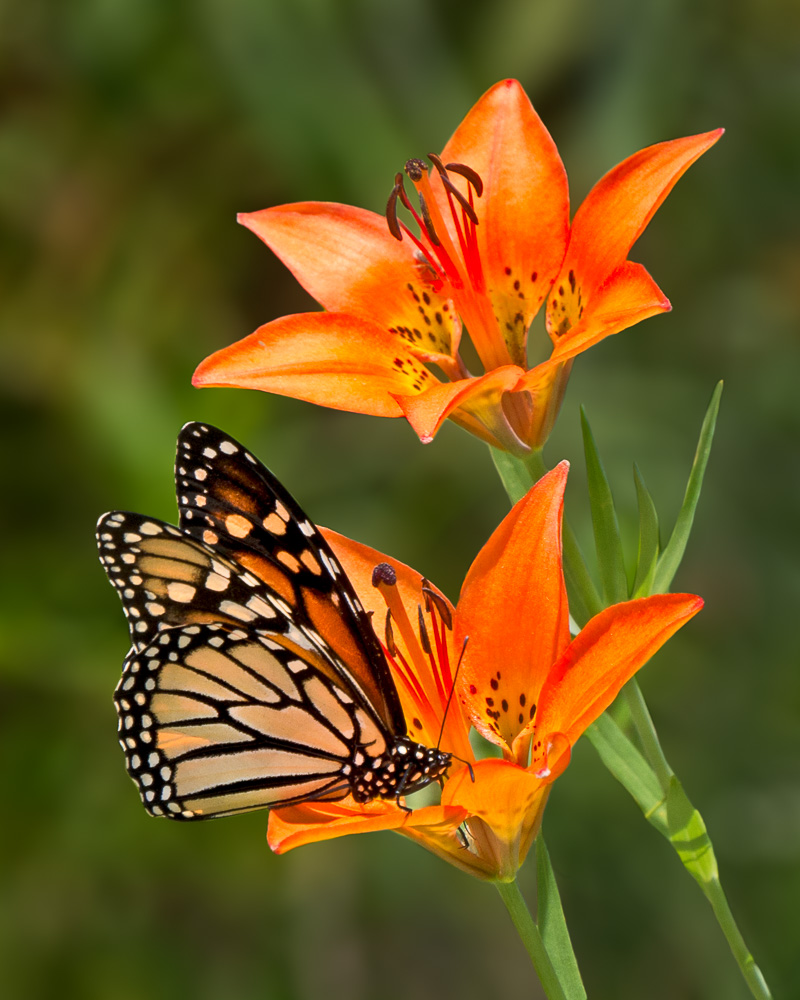 The prize of the day came early in our hike. A short ways down the “Little Ben” trail, we noticed several bright orange wood lilies. To our delight a Monarch butterfly was perched on one, sucking up nectar. These days I take special notice when I see a Monarch butterfly – it is becoming a rather rare experience. The population of Monarchs is declining due to a loss of habitat. We saw only three Monarchs on our hike – would have expected more considering the excellent habitat for Monarchs at the Northland Arboretum. (For more information on the declining Monarch population and what you can do, check out the MonarchWatch.org website.)